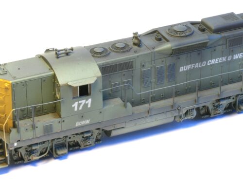 Here are a couple of photos from the test, showing a few covered hoppers and a BC&W GP9. This is the west part of the layout, where the Maple Hollow Farmers Co-op is located, with its grain elevator, feed mill, and fertilizer facilities.