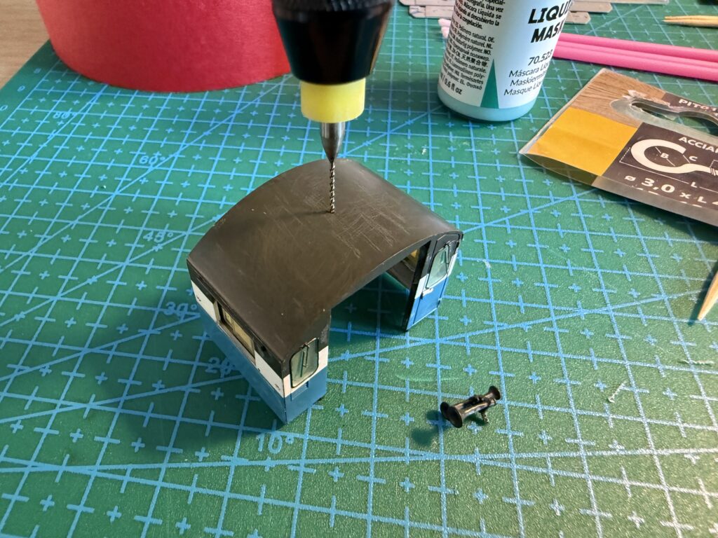 Before reassembling the cab, I converted the cab interior for short-hood-forward operation. I trimmed a few sections of the cab interior to fit it properly over the chassis and drilled new holes to secure the cab to the shell.